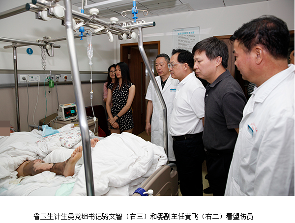 7月16日,省卫生计生委党组书记骆文智率委副主任黄飞等到广东省第二人民医院看望15日晚该院收治的广州301路公交车爆燃伤员,并指导救治工作。